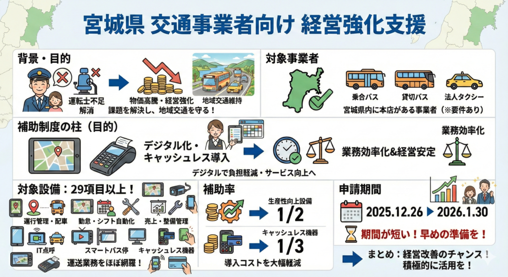 本補助金は、宮城県内のバス会社、タクシー会社、貸切事業者にとって、経営改善の大きなチャンスです。業務のデジタル化を進め、収益性を高め、地域交通を守るためにも、ぜひ積極的に活用してください。