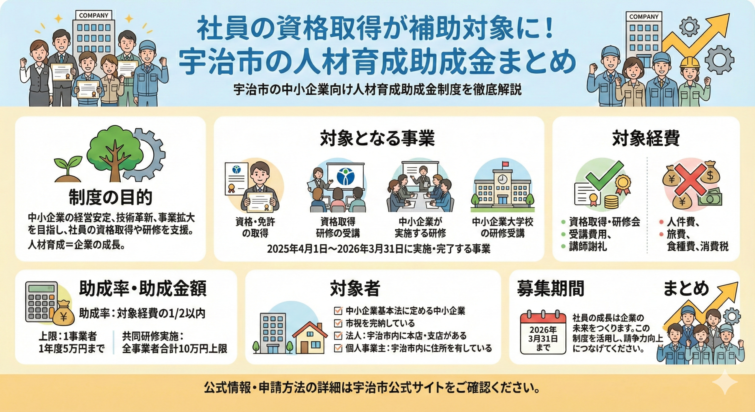 宇治市では、中小企業の経営安定、技術革新、事業拡大を目的として、企業内の人材育成にかかる費用の一部を助成する制度を実施しています。本記事では制度の内容、対象者、補助金額、申請期限までわかりやすく解説します。