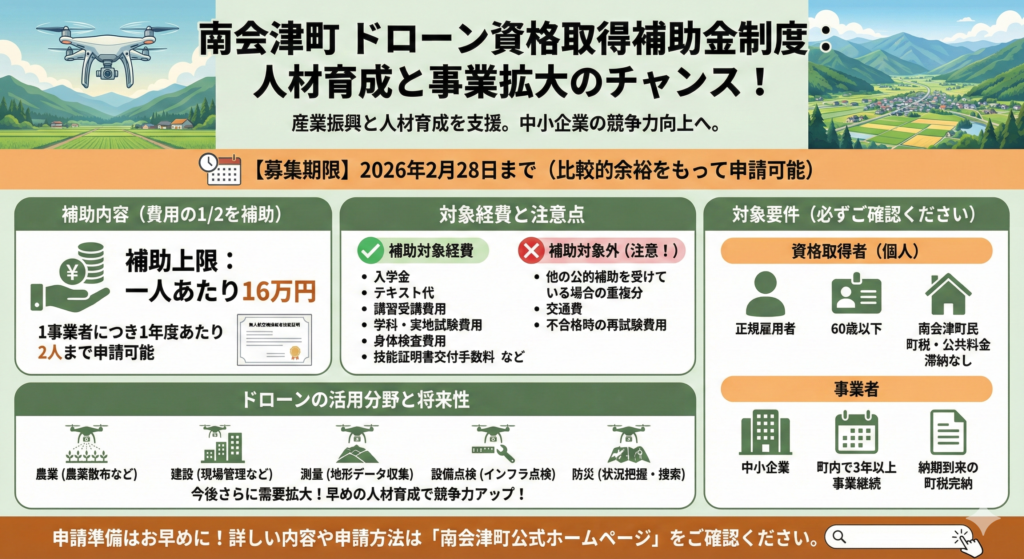 南会津町で事業を行う中小企業にとって、本補助金は人材育成と事業拡大の大きなチャンスといえるでしょう。ドローン導入や資格取得を検討している場合は、早めの情報収集と申請準備をおすすめします。