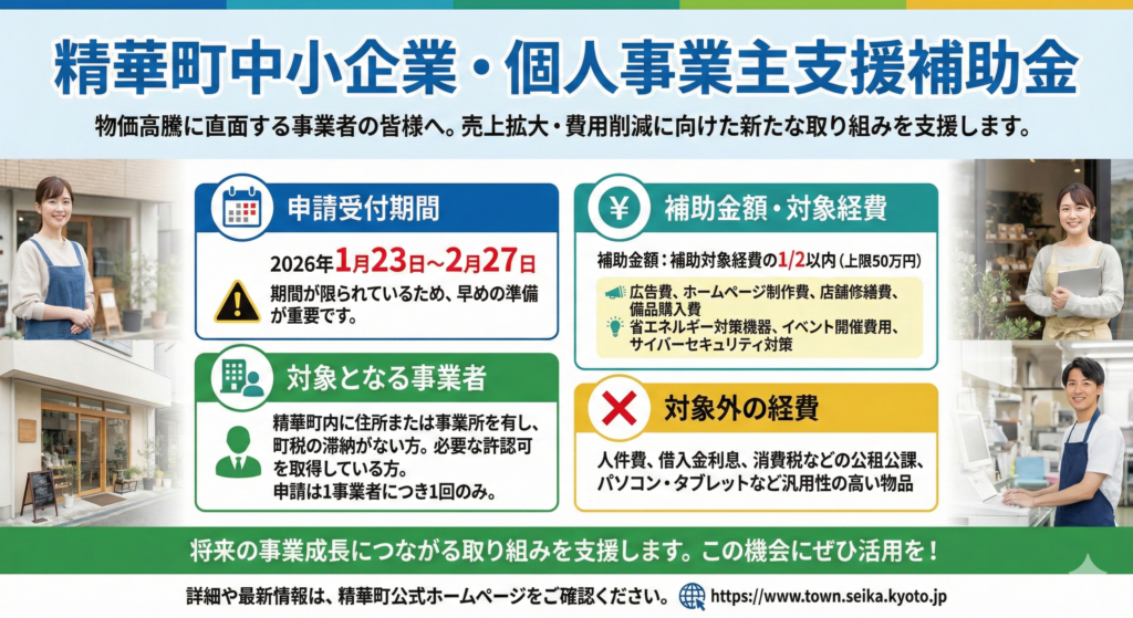 この補助金制度は、短期的な資金支援だけでなく、将来の事業成長につながる取り組みを支援するものです。売上アップや業務改善を考えている精華町の事業者の方は、ぜひこの機会に活用を検討してみてください。