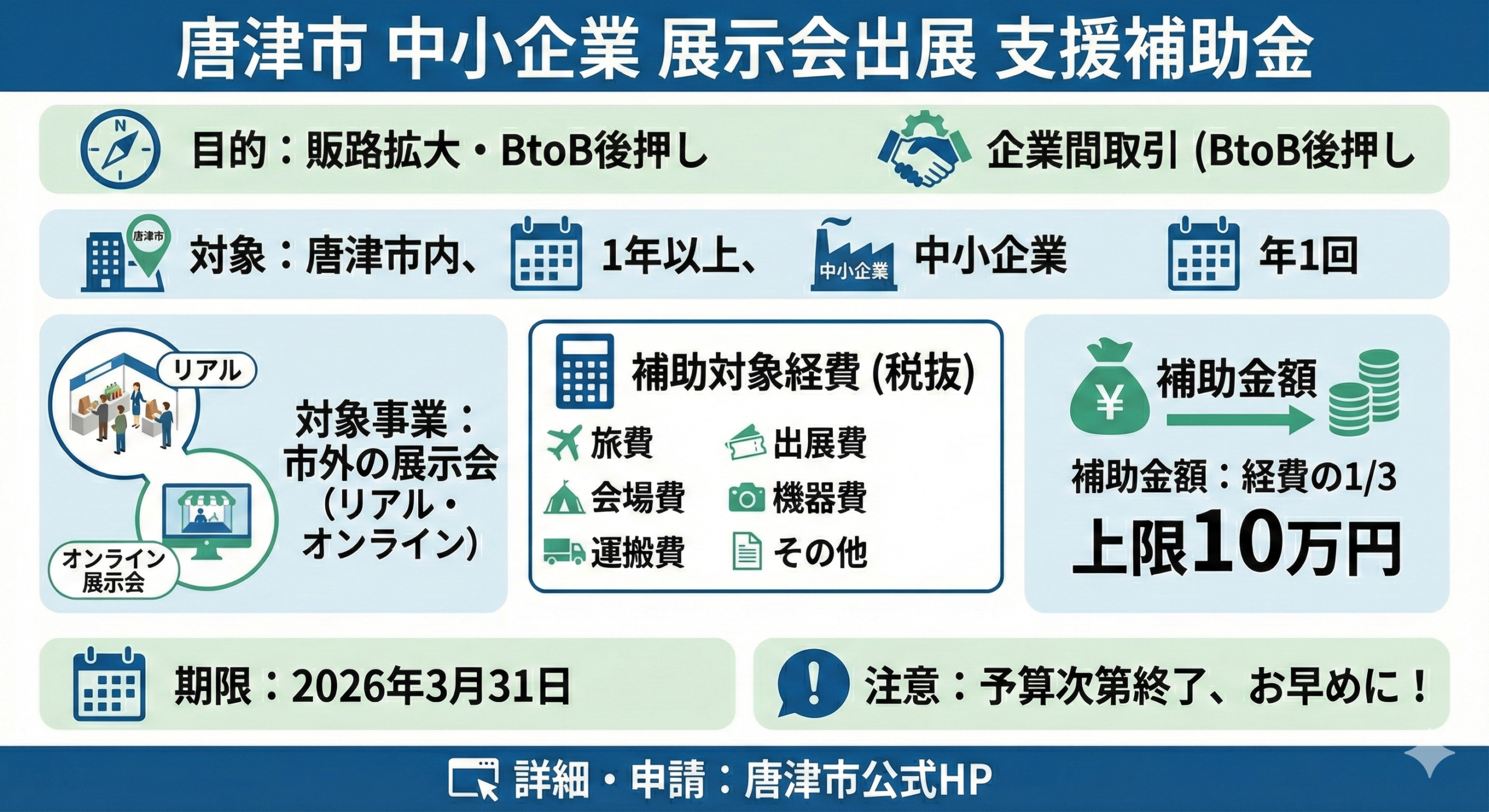 唐津市では、市内の中小企業が自社商品の販路拡大や魅力発信を進めるため、市外で開催される展示会への出展費用を支援する補助金制度を実施しています。本記事では、制度の内容や対象者、補助金額について、初めての方にもわかりやすく解説します。