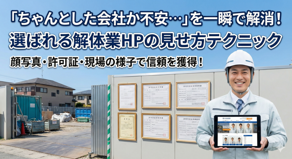 では、どうすればその「不安」を一瞬で「安心」に変え、「ここなら大丈夫そうだ」と思ってもらえるのでしょうか。今回は、解体業のHPで信頼を勝ち取るための具体的な見せ方をご紹介します。