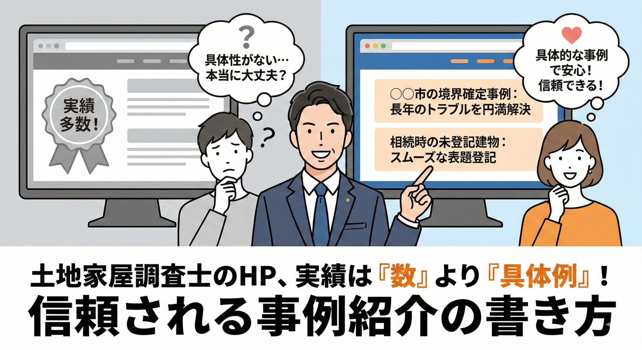 その方が、「〇〇市で、長年の隣人トラブルとなっていた境界確定を円満に解決した事例」を見つけたら、どう思うでしょうか。