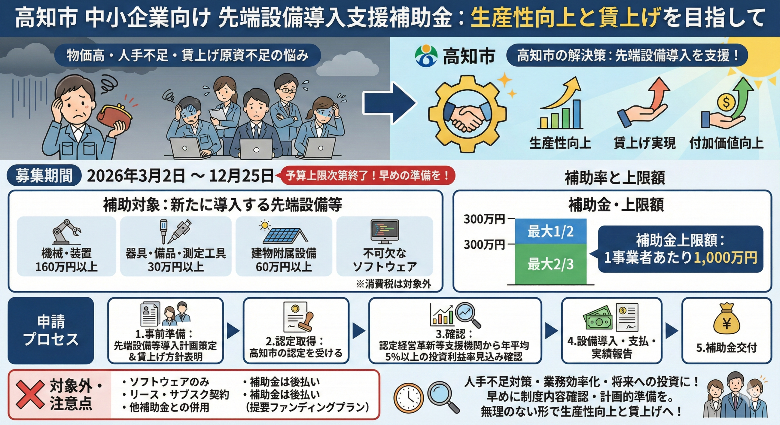 こうした課題を解決するために、高知市では先端設備等の導入を支援する補助金制度を実施しています。