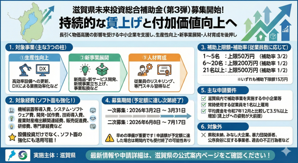 滋賀県内の中小企業に向けて、「滋賀県未来投資総合補助金(第3弾)」の募集が開始されます。本補助金は、長引く物価高騰の影響を受ける企業を支援し、持続的な賃上げの実現と付加価値額の向上を目的とした制度です。