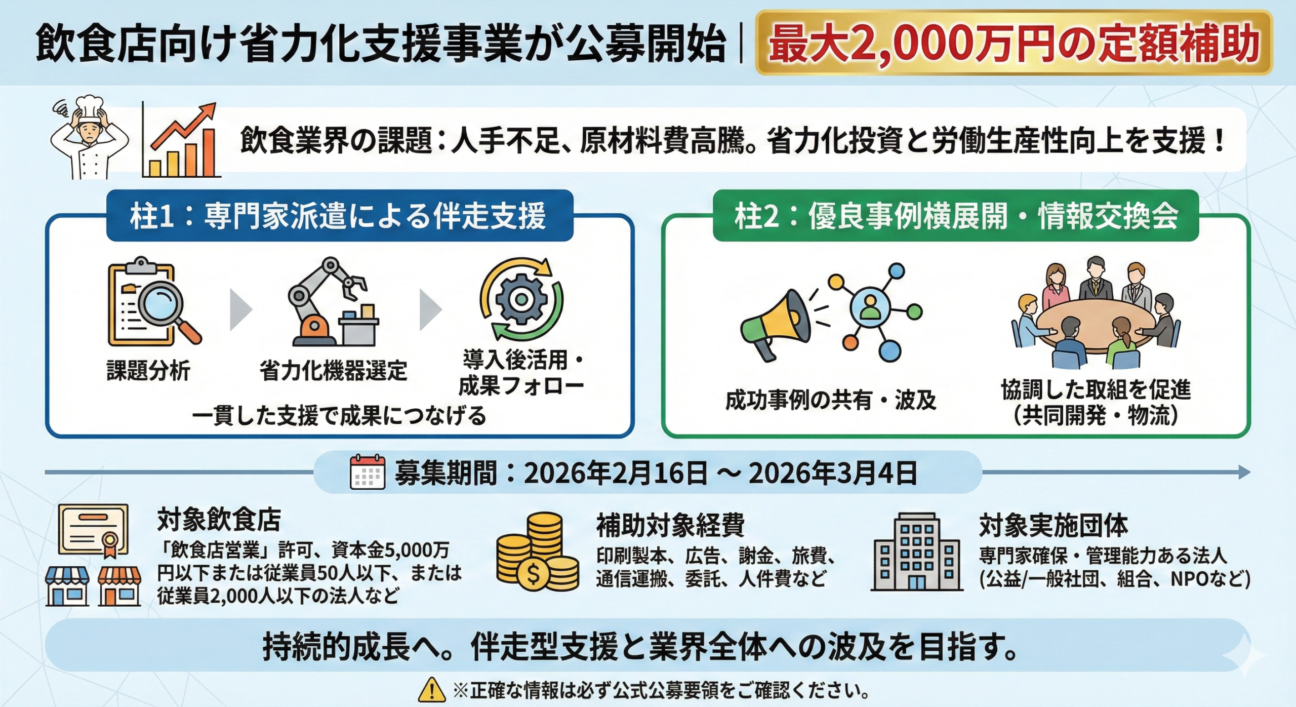 今回の支援制度は、単発の補助ではなく、伴走型での支援と業界全体への波及を目指す点が大きな特徴です。飲食店経営の改善や事業拡大を検討している方は、公募期間内に詳細を確認し、活用を検討することをおすすめします。