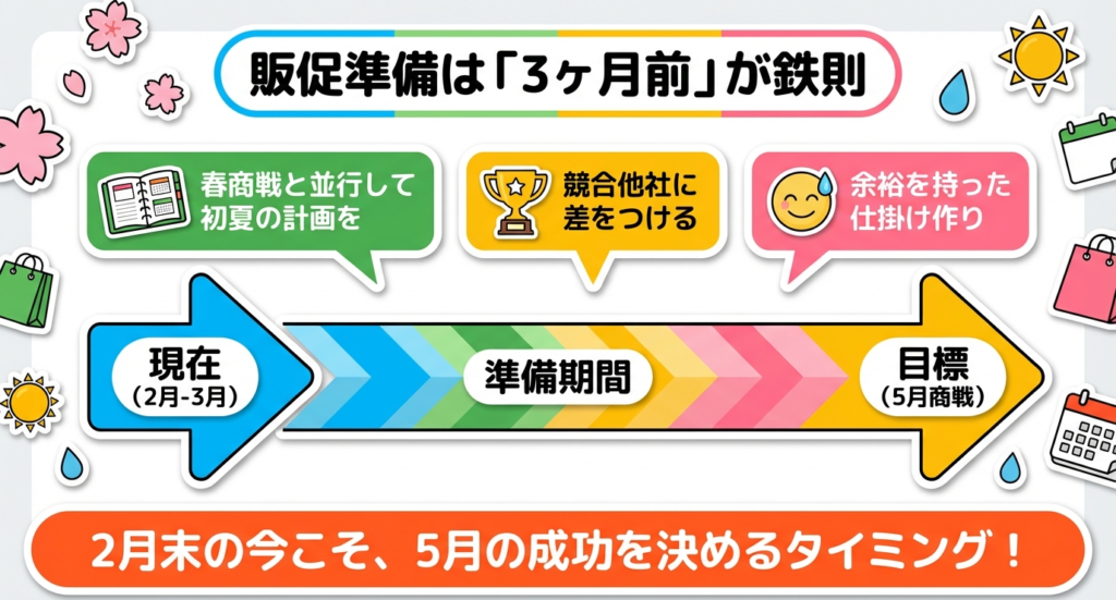 販促の準備は「約3ヶ月前」から動き出すのが鉄則だからです。
