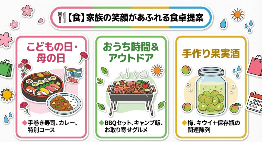 「食」では家族で楽しむメニューや行楽・アウトドア向けの食材提案、