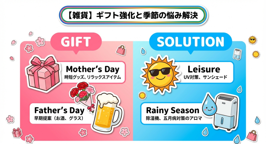 「雑貨」では母の日ギフトや梅雨・夏に向けた季節対策グッズの展開、