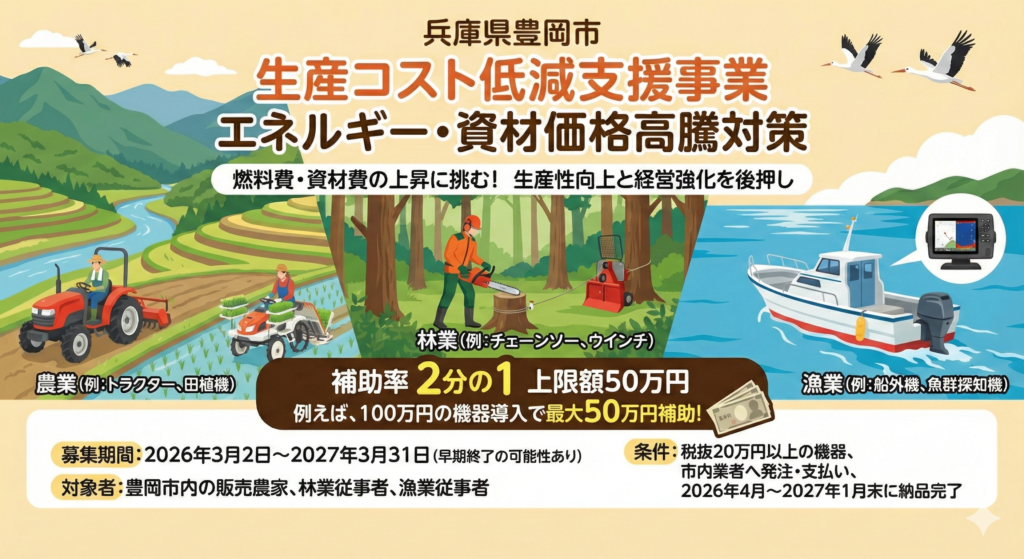 豊岡市で農林水産業を営む方は、この機会に設備投資と経営改善を同時に進める選択肢として、ぜひ本制度の活用をご検討ください。