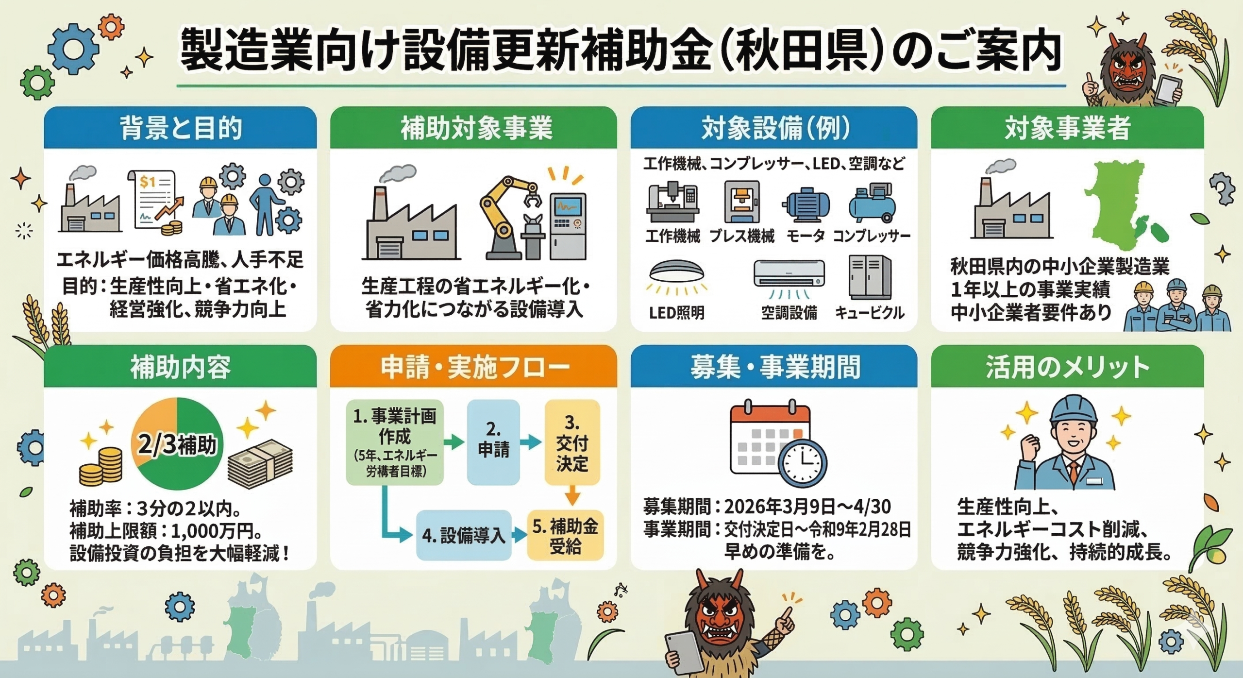 制度の詳細や最新情報については、秋田県の公式ホームページで確認することができます。設備更新を検討している製造業の企業は、この機会に補助金の活用を検討してみてはいかがでしょうか。