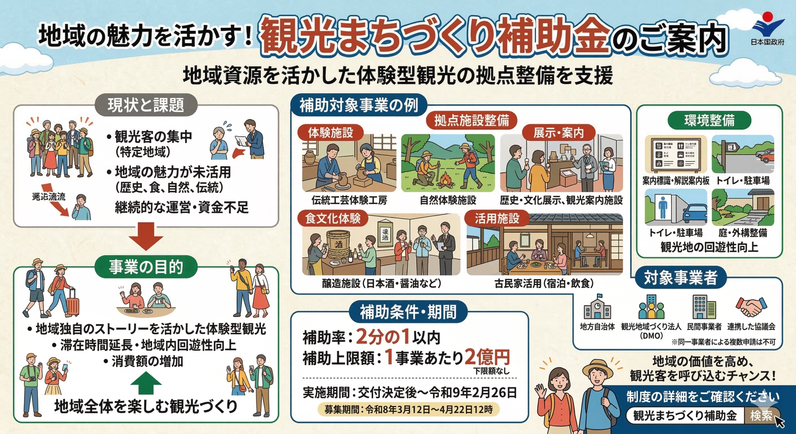 こうした課題を解決するため、国では地域資源を活かした観光まちづくりを支援する補助事業の公募を開始しました。この制度では、地域の歴史、食、自然、文化などの魅力を活かした観光コンテンツの拠点となる施設整備などに対して支援が行われます。