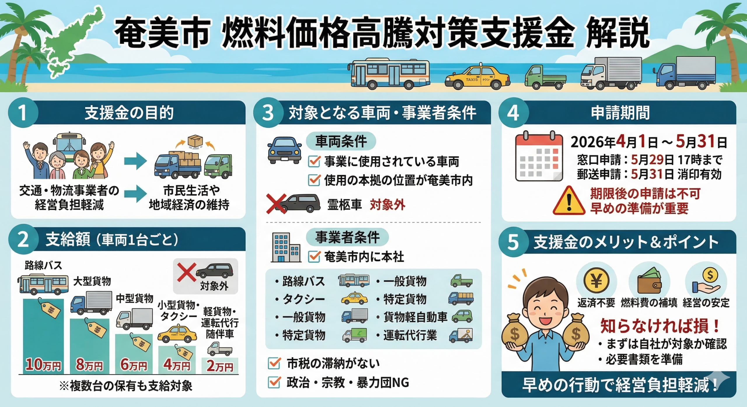 対象となる事業者の条件についてです。奄美市内に本社を有していることに加え、路線バス事業者、タクシー事業者、一般貨物自動車運送事業者、特定貨物自動車運送事業者、貨物軽自動車運送事業者、自動車運転代行業者のいずれかに該当する必要があります。また、市税に滞納がないことや、政治団体・宗教団体でないこと、暴力団関係者でないことも条件として定められています。