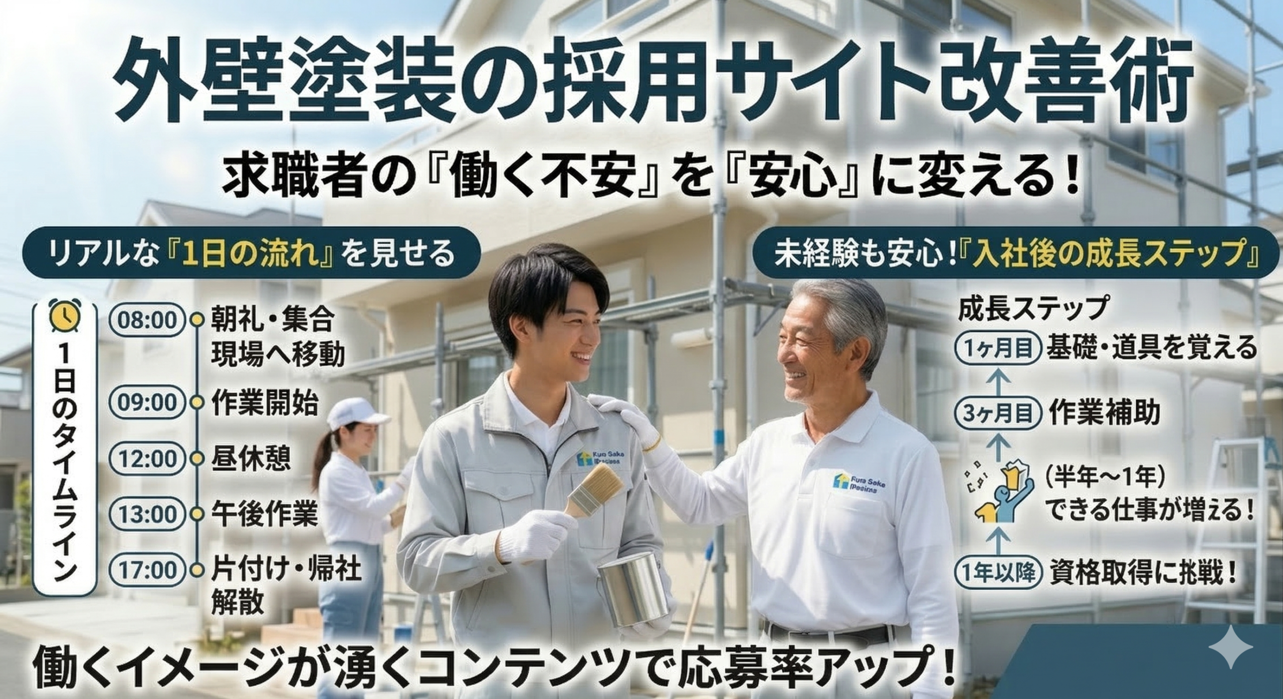 「1日のスケジュール」と「入社後のステップ」。 この2つの情報が採用HPにあるだけで、未経験者は「この会社ならちゃんと育ててくれそう」「自分でもやっていけそう」とかなり安心します。