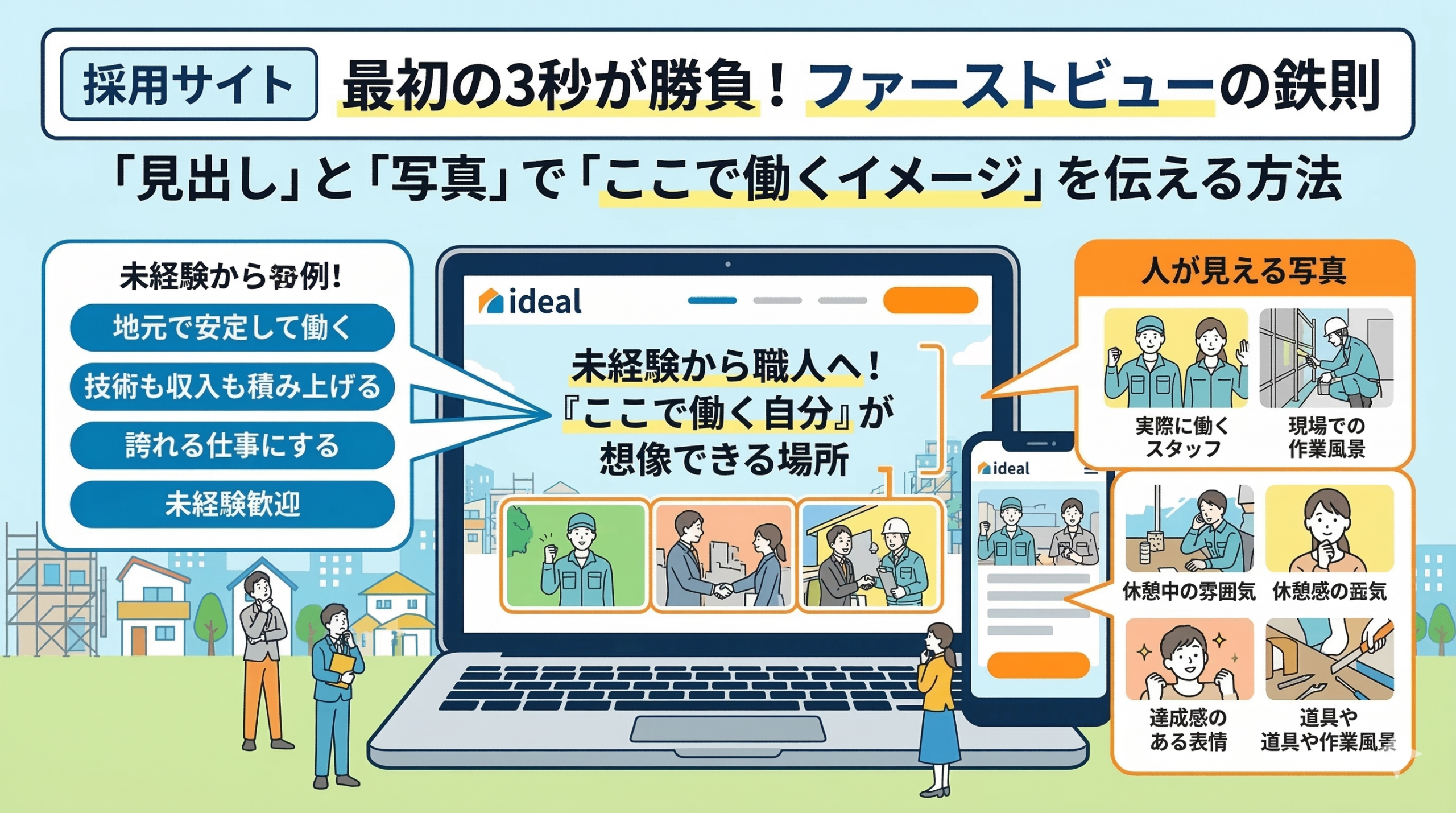 キャッチコピーと同じくらい重要なのが、背景やメインに使われる「写真」です。 建設業や塗装業のHPでよく見かけるのが、綺麗に仕上がった「建物の写真」だけを載せているケースですが、採用HPにおいてはこれは非常にもったいないです。