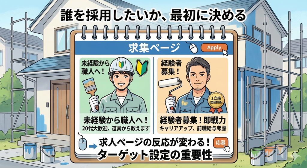 ここが明確になれば、使うべきキャッチコピーや、掲載する現場の写真、アピールすべき会社の強みも自然と決まってきます。