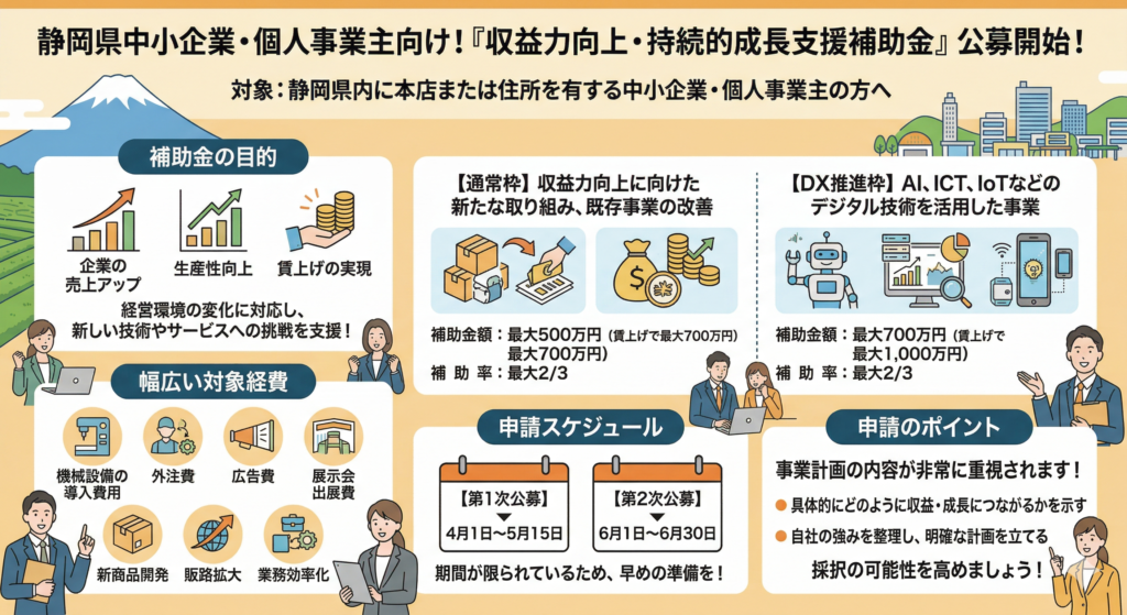静岡県で事業を行っている中小企業や個人事業主に向けて、収益力向上と持続的な成長を支援する補助金制度が公募開始となります。本記事では、制度の概要から申請のポイントまでをわかりやすく解説します。