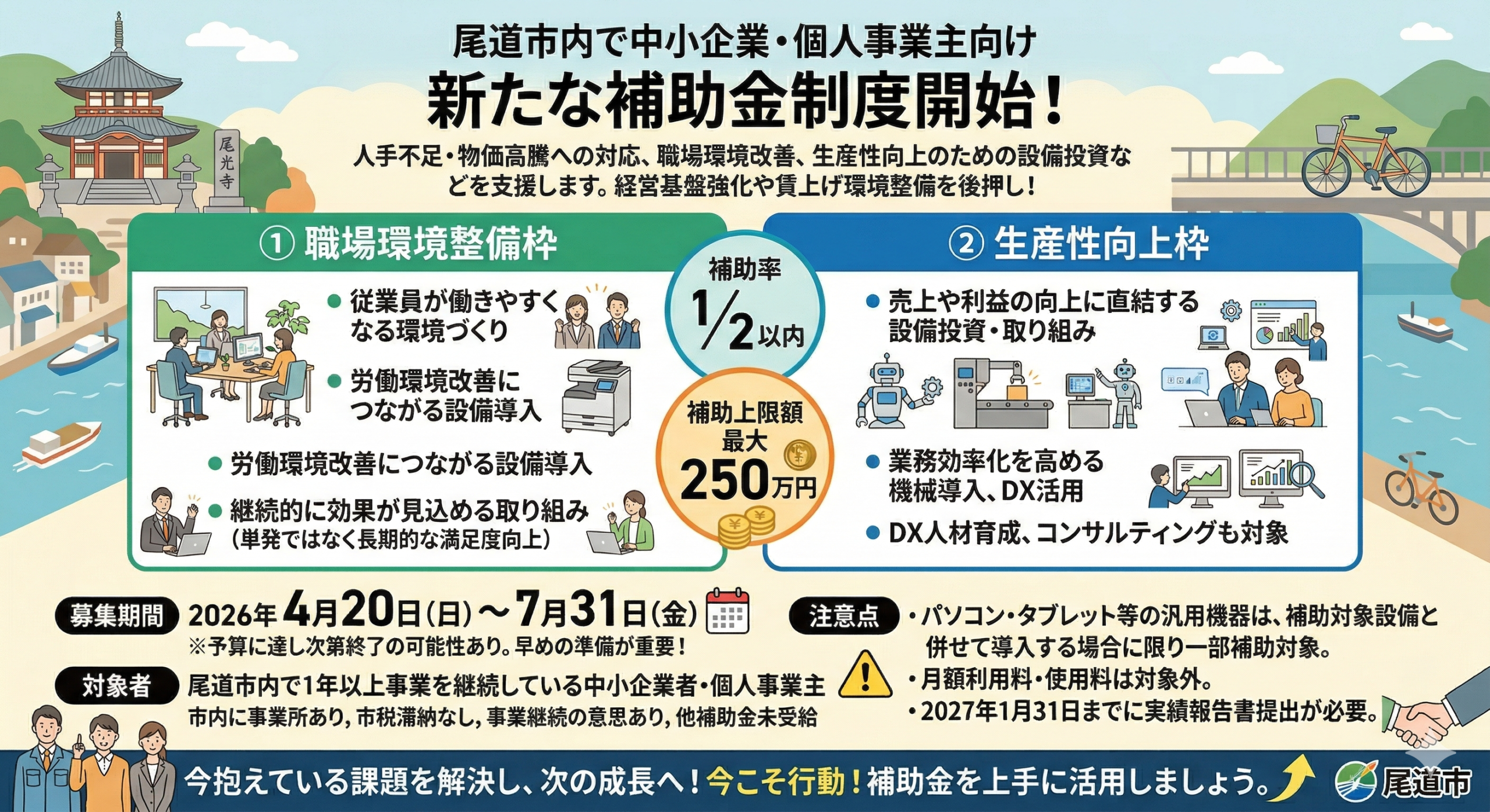 尾道市では、人手不足や物価高騰の影響を受けている中小企業や個人事業主を支援するため、新たな補助金制度が開始されます。本制度は、職場環境の改善や設備投資による生産性向上を目的としており、経営基盤の強化や賃上げ環境の整備を後押しする内容となっています。