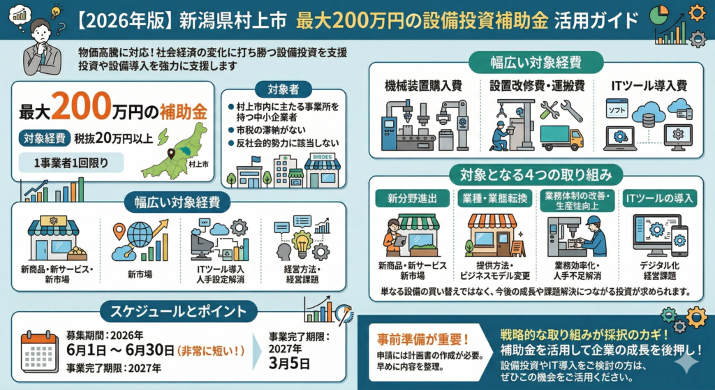 新潟県村上市では、社会経済の変化に対応するための取り組みを支援する補助金制度が実施されています。本記事では、その内容や対象者、活用ポイントについて分かりやすく解説します。
