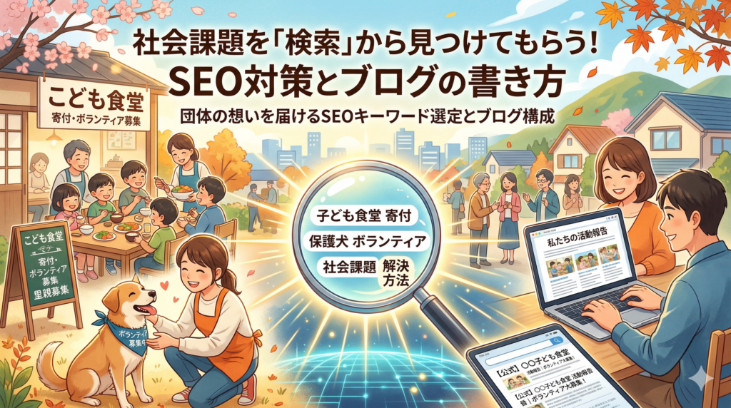 「子ども食堂」や「保護犬」といった単一のキーワードは、大手メディアや大規模な団体が上位を占めているため、検索上位に表示させるのは非常に困難です。